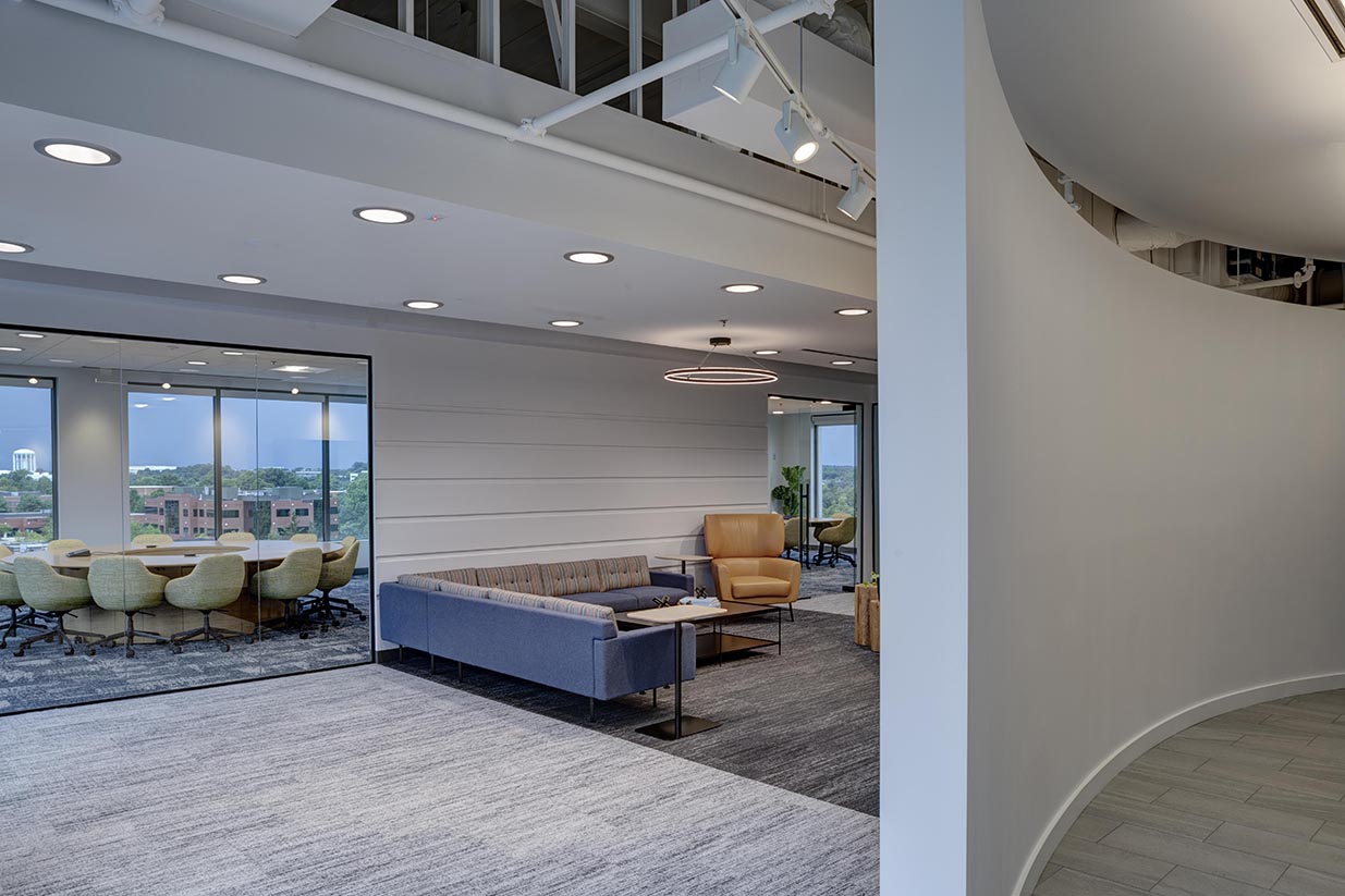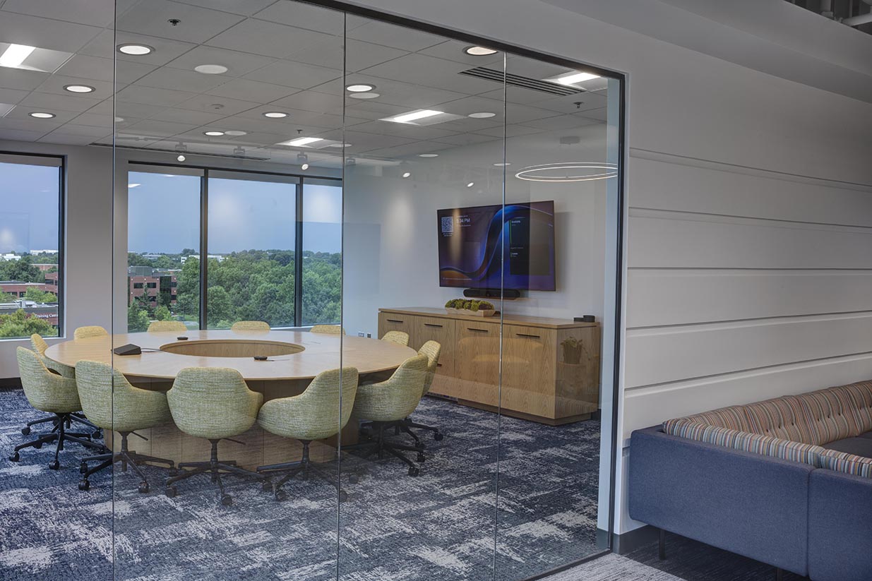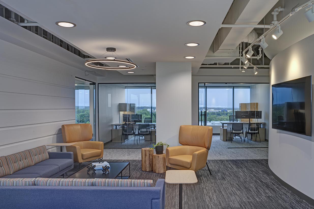This complete renovation of the entire 5th floor (approximately 20,000 SF) transformed existing office space into the new regional corporate headquarters for Tate, Inc. within a 5-story office building in Columbia, MD. The project featured high-end finishes, custom millwork, modular glass walls and doors, sound baffles, custom lighting and controls, new executive and conference areas, elevator lobbies, wall graphics and stonework.