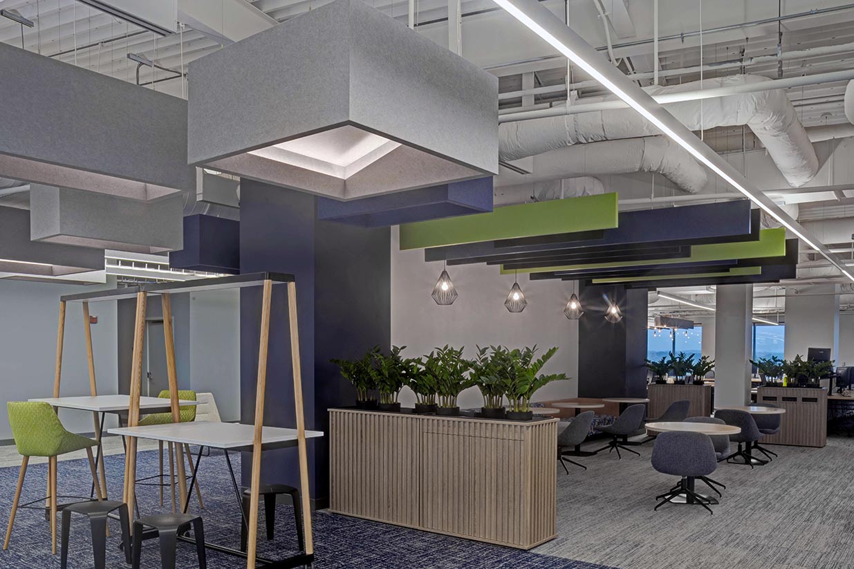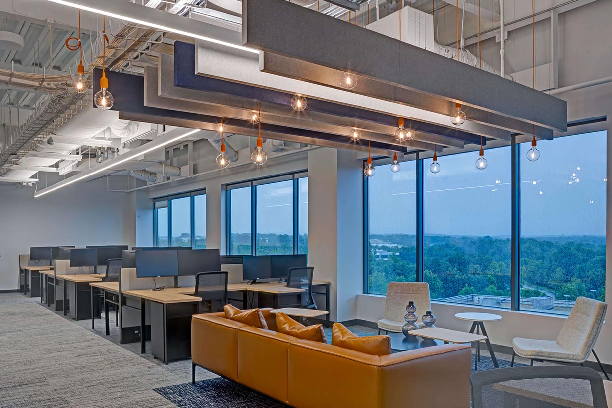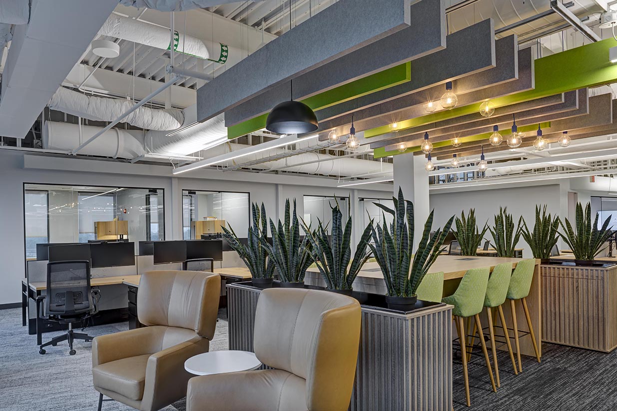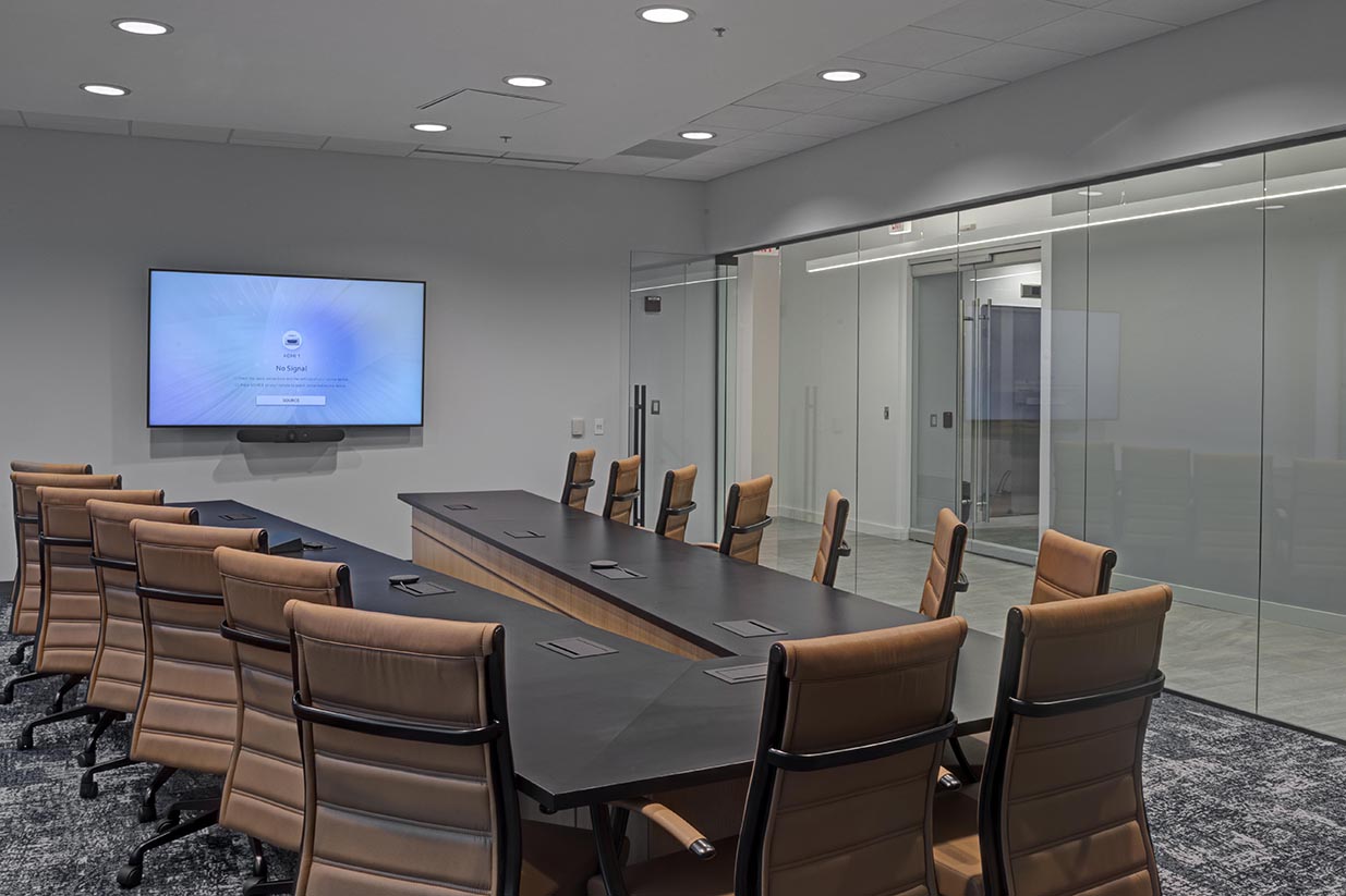 The sophisticated lighting and controls package consisted of approximately 20 different fixtures with custom layout patterns designed to blend seamlessly with sound baffles and furniture placement. Modular glass walls and doors throughout all offices and conference rooms provide exceptional aesthetics and openness to the space, allowing natural light from exterior windows to extend throughout the entire floor.